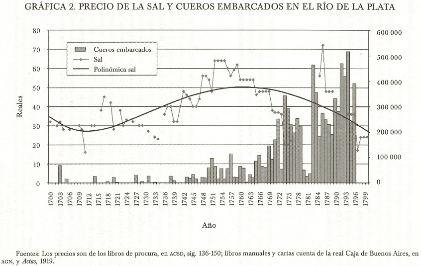 Analizando las variaciones del precio de la sal en términos comerciales, no debe extrañarnos la escasa correlación entre el precio de la sal y la exportación de cueros. Como se puede apreciar en la gráfica 2, vemos que el precio de dicho bien se mueve independientemente del bien de exportación, esto se debe a que el método utilizado durante el siglo XVIII para secar los cueros no era mediante el uso de sal, sino a través del secado al sol. No sería hasta fines de siglo cuando la tradicional técnica de secar los cueros fuera reemplazada por la utilización de la sal.