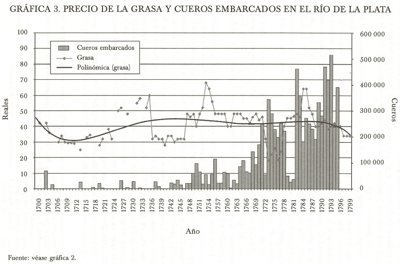 En la vinculación de estos productos con el comercio podemos apreciar la misma relación. El producto a partir del cual se realizaron las comparaciones fue el cuero, el cual puede almacenarse manteniendo las mismas características. En el caso de la grasa y la carne, ambos eran subproductos del cuero. En el primer caso, el precio muestra una tendencia estable a lo largo de todo el ciclo, aunque se puede observar cierta correlación inversa, en este ejemplo puntual, entre la cantidad de cueros exportada y el precio de la grasa. Un aumento en la matanza de animales producía un descenso en el precio de este producto. Otro elemento que incidió en la determinación del precio fue el factor climático, periodos grandes de sequías podían complicar el abasto de grasa y carne de la ciudad y, de esta manera, sus precios. En segundo lugar, el precio de la carne mostró una tendencia al alza a lo largo del siglo, lo que confirma la hipótesis del cambio de precios relativos entre la carne y el trigo. Asimismo, las tendencias de los precios de los productos locales no muestran variaciones significativas con respecto a los cambios institucionales generados por la creación del virreinato del Río de la Plata (1776) o el Reglamento de Libre Comercio (1778).