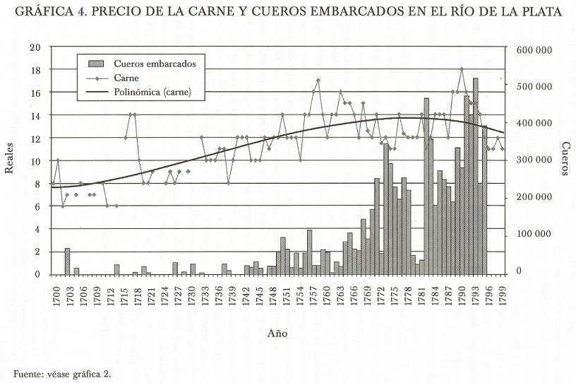 Lo que resulta llamativo en el caso de la carne es que una mayor matanza de animales no significó una reducción del precio del subproducto, sino lo que se observa es que la carne mantuvo su tendencia ascendente a largo del siglo, independientemente del aumento en la exportación de cueros. Esto puede haber ocurrido por varias razones. Por un lado, los cueros podían almacenarse durante varios meses, por lo tanto, un aumento en su exportación no implicaba que aumentaran las matanzas en ese año, lo que se refleja claramente en la gráfica 4. No se perciben cambios bruscos en los precios, sino que se mantuvieron estables con una tendencia a la alza durante todo el siglo. Asimismo, la carne era un producto que no se podía conservar, por lo que el precio dependía de un abasto constante y continuo de reses hacia la ciudad. Se ha visto que el Cabildo se vio obligado a intervenir sistemáticamente en el mercado fijando precios u obligando a abastecer a la ciudad.