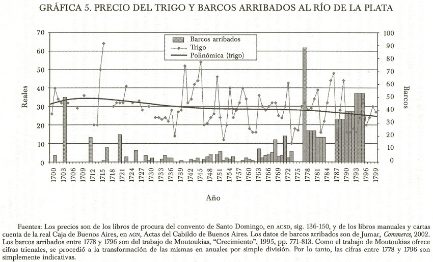Una característica importante a tener en cuenta era que el precio del trigo para el abasto de los navíos era superior al de la plaza porteña, y estaba regulado por el Cabildo de la ciudad,59 por lo que la llegada de barcos no impactaba de manera directa, sino indirecta en el precio de plaza.