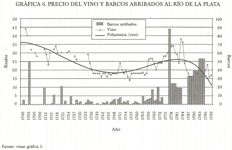 A primera vista, se observa una relación inversa en ciertas coyunturas entre el precio del vino y el arribo de barcos al Río de la Plata. Una de las excepciones, por ejemplo, ocurrió a fines de la década de 1770 cuando el arribo de la armada de Cevallos incrementó el consumo de vino.