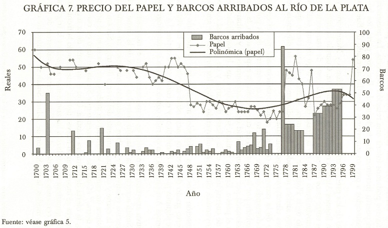 La demanda de este bien (reducida en comparación a la del vino) y los costos de transporte interoceánicos pudieron ser los motivos por los cuales su precio se mantuvo alrededor de los 50 reales durante los primeros años del siglo. En la década de 1730 los precios bajan, probablemente por una mayor oferta causada en el incremento en el arribo de navíos. Más tarde los precios suben como consecuencia de una baja en la oferta por el corte del comercio internacional originado por la guerra de la Oreja de Jenkins (década de 1740). Pero este aumento fue circunstancial y la reducción en los costos de transacción del comercio ultramarino condujeron a una reducción significativa en el precio.71 Como puede observarse en la gráfica 7, para 1749 el precio cae a 28 reales y de allí en adelante comienza una segunda fase en el precio del papel. Se mantiene estable entre 20 y 30 reales hasta 1778, año en que vuelve a subir el precio. Posiblemente el aumento del precio entre 1776 y 1779 se debió a la instauración del virreinato y del resto de los organismos burocráticos anexos. El funcionamiento de estas oficinas seguramente generó un incremento importante en la demanda de este insumo. El precio del papel se mantiene aproximadamente entre 40 y 50 reales hasta 1785, en que nuevamente desciende alrededor de los 30 reales.