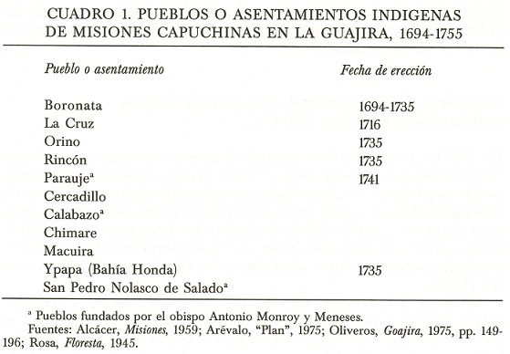 La característica de asentamiento "múltiple" de los indios guajiros hizo que los misioneros capuchinos adoptaran la estrategia de fundar pueblos en los cuales intentaban concentrarlos para facilitar la labor de evangelizarlos. Según fray Antonio de Alcacer, para 1724, se pacificó y fundó el pueblo de La Cruz, con más de 200 indios bautizados; San Antonio de Orino, con más de 300 almas; San Nicolás de los Menores, fundado por Mariano de Olocau en 1716, con casi 500 indios, y finalmente, San Juan del Rincón. El obispo de Santa Marta, por su parte, fundó los pueblos de San Pedro Nolasco de Salado, San Ramón de Parauje y Nuestra Señora de la Merced de Calabozo.54 En el año de 1726, quedaron cinco pueblos de misiones entre los indios: "El pueblo de Menores, el pueblo de Orino, La Cruz, El Toco y el Palmarito. Y por controversias y pleitos que los padres tuvieron con el ilustrísimo señor obispo [Monroy] de Santa Marta, dejaron los padres capuchinos dichos pueblos y pasó el obispo clérigos regulares de curas en ellos."55 Posteriormente, hacia el año 1736 volvieron los misioneros a la Guajira y fundaron nuevamente en el sitio de Menores el pueblo de Boronota; el Toco, con el nombre del Rincón de Cayus; San José de Leonisa (La Cruz) y San Francisco de Orino. Para 1755 el pueblo de Boronata tenía 438 habitantes "en otros 200 y más bautizados de este pueblo que andaban apostados y fugitivos por los montes y bosques, sin jamás venir al pueblo, por la ninguna sujeción y libertad con que viven sin apremio de sus cabezas de justicia."56 Este poblado prácticamente era de mestizos y tenía una tasa relativamente alta de esclavos negros. A diferencia de Boronata, el pueblo de Nuestra Señora del Socorro del Rincón de Cayus, en 1755, albergaba a 324 habitantes, "de las familias e indios puros [...] con la advertencia de que ninguno está casado legítimamente por la Iglesia sino según su ley, por la dificultad que es quitarle esta secta, comprándolas [mujeres] por una vaca o una bestia".57 El pueblo de San José Leonisa Capuchino, fundado con los indios dispersos del antiguo pueblo de La Cruz, contaba con 420 indios; Orino, fundado con los mismos indios que algún día había tenido, tenía ahora 306.58 Posteriormente, cuatro reverendos capuchinos se encaminaron hacia la Alta Guajira, en donde fundaron sendos pueblos: Macuira, Bahía Honda, Sabana del Valle y Chimare.