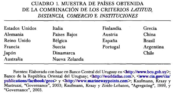 La definición del grupo de países con los cuales contrastar la trayectoria económica de Uruguay durante el siglo XX no es trivial. Cuatro son los criterios empleados en este trabajo para construir la muestra de países con los cuales se compara el desempeño económico de largo plazo de Uruguay: la latitud en la que están ubicados los países (latitud), la distancia de centros económicos mundiales dinámicos (distancia), la importancia relativa del país en el intercambio comercial con Uruguay en el periodo 1961-2001 (comercio) y la calidad de las instituciones (instituciones).