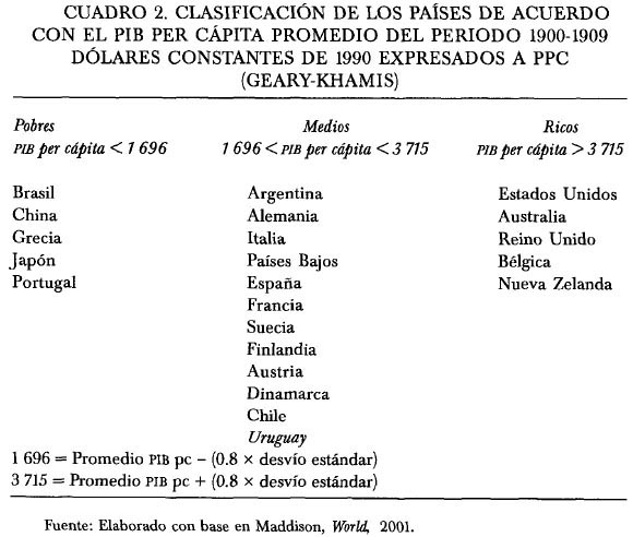 16 En Willebald, "Crecimiento", 2001, y en Oddone y Willebald, "Uruguay", 2001, se propone un ejercicio de convergencia de "clubes" basado en la metodología propuesta por Quah, "Regional", 1996, y "Empirics", 1997. A partir de ellos, se concluye que durante la segunda mitad del siglo XX Uruguay converge a un grupo de economías pobres liderado por Argentina.