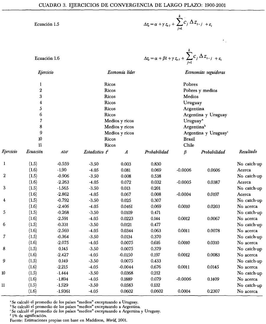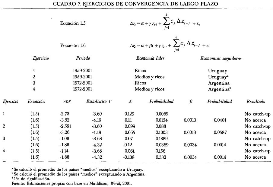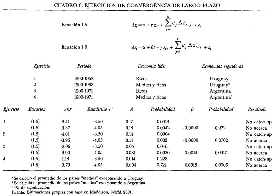 Al igual que para los resultados obtenidos para todo el siglo XX, entre 1900 y 1958, Uruguay ni convergem se acerca en términos de PIB per cápita a los países que eran "ricos" y "medios ricos" entre 1900 y 1909. Argentina, antes de 1971 ni "converge" ni "recorta distancias" con los países que eran líderes a comienzos de siglo en términos de PIB per cápita, más bien existe evidencia a favor de que se produce un leve alejamiento (véase cuadro 6, p. 47). Estos ejercicios fueron repetidos para el periodo 1959-2001 en el caso de Uruguay y para el periodo 1972-2001 en el caso de Argentina (véase cuadro 7, p. 48).