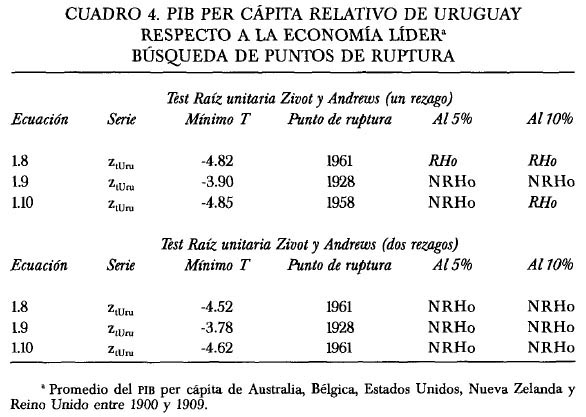 23 Al considerar dos rezagos, no se detectan puntos de ruptura de la serie bajo ninguna de las tres especificaciones. Sin embargo, con dos rezagos el año 1961 aparece con mínimo t. Estos resultados son consistentes con los obtenidos por Oddone y Willebald, "Uruguay", 2001, para el periodo 1900-1990 usando una economía líder diferente, quienes encuentran un cambio de tendencia en 1949 y un cambio de nivel y de nivel-tendencia en 1961. Los resultados hallados también son consistentes con las interpretaciones tradicionales acerca del declive de Uruguay, las que suelen identificar a los años cincuenta del siglo XX con el agotamiento del proceso de crecimiento basado en una estrategia de sustitución de importaciones y a los años sesenta con una etapa de fuerte estancamiento e inflación (Instituto, Proceso, 1969, y Reajuste, 1973; Oficina, Plan, 1977, y Rama, "Crecimiento", 2003).