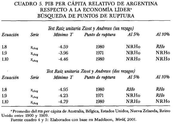 La serie de PIB per cápita relativo de Argentina respecto a los países ricos presenta un cambio de nivel en 1980 (a 10% de significación) cuando se trabaja con un rezago. Al considerar dos rezagos, se detecta un cambio de nivel en 1980 (a 5 y a 10% de significación) y un cambio de tendencia en 1971 (a 10% de significación) (véase cuadro 5, p. 46).