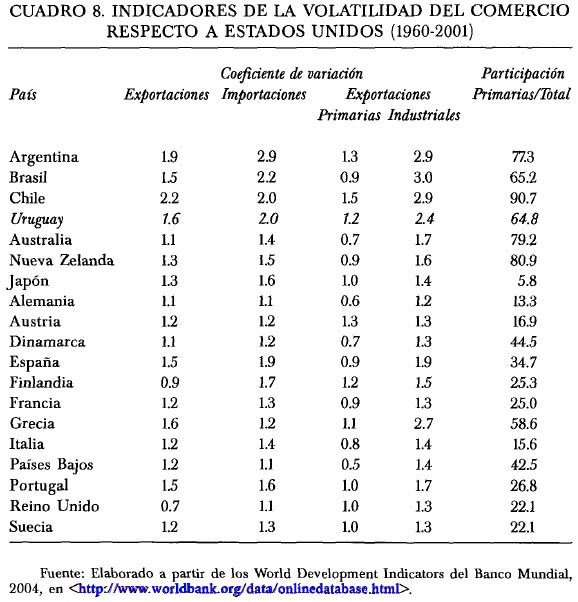 En el caso de Uruguay, como respaldo del primer tipo de argumentos puede citarse al reciente trabajo de Bértola y Lorenzo (2003) en el que los autores muestran cómo las fluctuaciones económicas eran comparativamente significativas antes de 1930, para volverlo a ser a partir de los años setenta del siglo pasado. En ambos periodos, estas fluctuaciones encuentran correlación positiva con la evolución de los términos de intercambio y con los ciclos de la economía mundial.