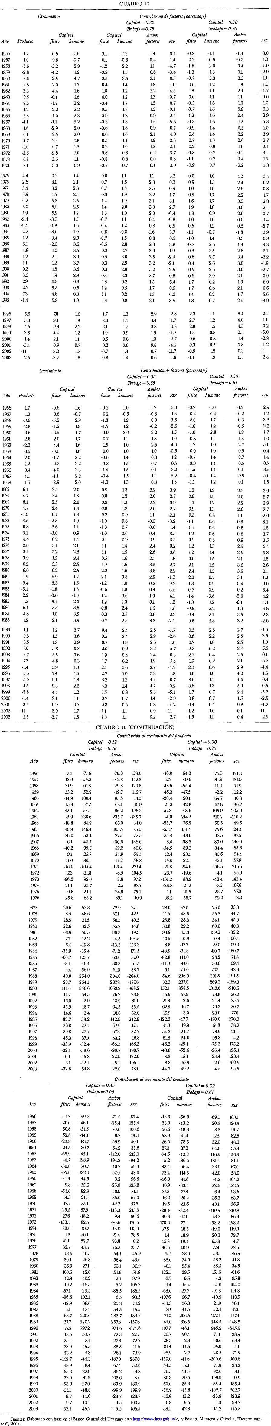 Del análisis anterior tenemos que la acumulación de trabajo y la mejora de su calidad es el factor cuya contribución al crecimiento del PIB ha sido más importante en los subperiodos analizados. Los resultados expuestos no deberían impedir ver que, debido a cómo se mide el capital humano en este trabajo, es probable que se esté sobrestimando su contribución al crecimiento o, lo que es lo mismo, se esté subestimando la contribución de la PTF. De todos modos, los resultados son consistentes con los obtenidos por Blyde y Fernández Arias (2004), Fossati, Mantero y Olivella (2004), de Brun (2001) y Bucacos (2000). En cualquier caso, una conclusión que es posible extraer de los resultados obtenidos es que al menos en la segunda mitad del siglo XX la productividad de la economía no contribuyó a explicar el crecimiento.