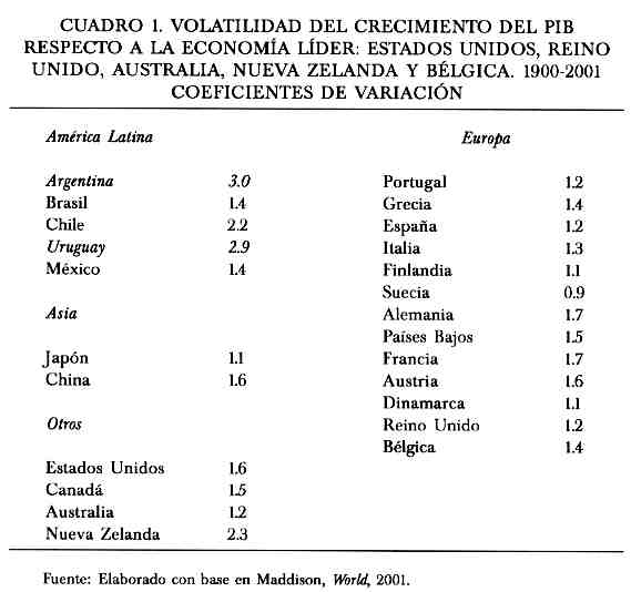 Una forma más rigurosa de comparar la profundidad de las fluctuaciones macroeconómicas que exhibe la economía de Uruguay durante el siglo XX es la que aparece en el cuadro 1, A partir de él se muestra que a lo largo del siglo XX la volatilidad de la tasa de crecimiento del pib de Uruguay es elevada al compararla con la de los países que integran la muestra seleccionada. Argentina presenta una volatilidad similar, mientras que Nueva Zelanda y Chile son los únicos que presentan un valor superior a dos. Debe tenerse en cuenta que Argentina, Chile, Nueva Zelanda y Uruguay son cuatro países cuyas exportaciones son intensivas en recursos naturales las cuales son propensas a ser volátiles. Sin embargo, la condición de productor de materias primas y alimentos no es una condición suficiente para explicar la profundidad de las fluctuaciones. El cuadro 1 muestra que Australia, Canadá, Brasil y México típicamente exportadores de productos intensivos en recursos naturales no exhiben una volatilidad elevada respecto a los países europeos grandes o Japón, típicamente exportadores de bienes manufacturados.