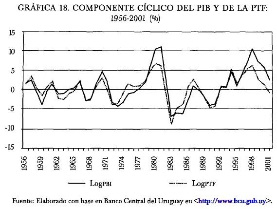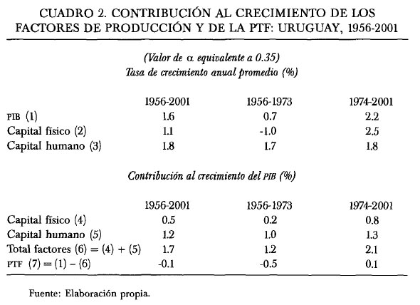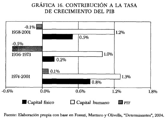 El cuadro 2 y la gráfica 16 muestran que, en promedio, entre 1956 y 2001 el crecimiento del PIB en Uruguay está fundamentalmente explicado por la contribución la acumulación de "trabajo aumentada por el capital humano" ("capital humano" en adelante). La contribución de la PTF fue, en promedio, negativa en el periodo (-0,1%). Ello significa que durante la segunda mitad del siglo XX la utilización y la productividad de los factores (lo que en realidad mide la FTF) no sólo no ha alentado el crecimiento, sino que lo ha "afectado negativamente".40