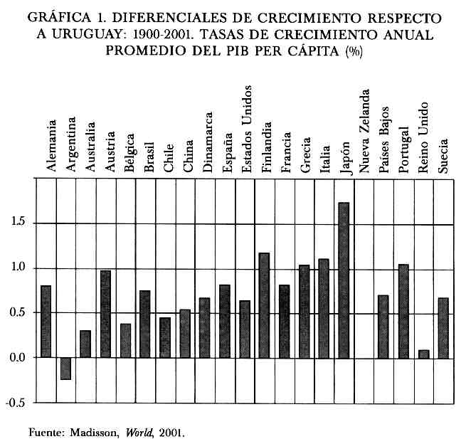 El aumento de la riqueza promedio de los habitantes de Uruguay entre 1900 y 2001 luce escaso cuando se lo compara con los otros países seleccionados (véase gráfica 1), sobre todo si se tiene en cuenta que varios de ellos parten de un nivel de riqueza sustancialmente superior como son el caso de Australia, Estados Unidos, Nueva Zelanda y Reino Unido, precisamente los que le "sacan menos ventaja" a lo largo del siglo. Debe notarse que de los países incluidos en la gráfica, sólo Argentina crece menos que Uruguay durante el siglo XX.