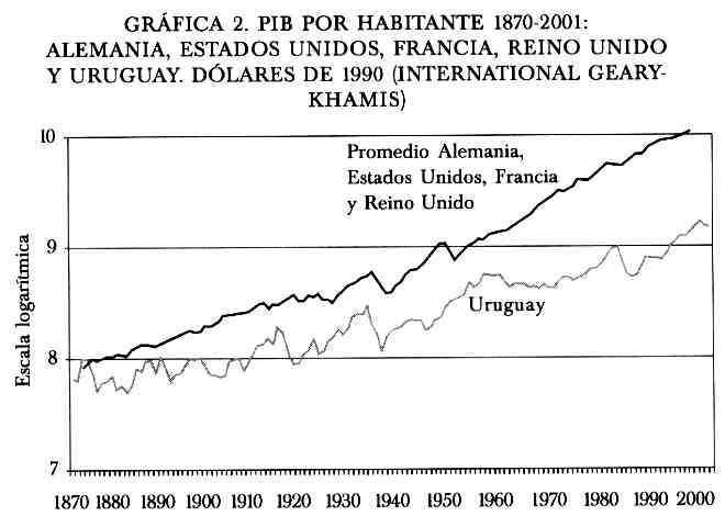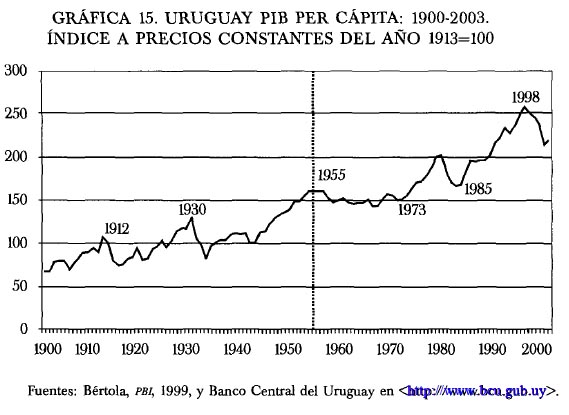 Estudios recientes, basados en estimaciones del PIB (Producto Interno Bruto) de todo el siglo XX, concluyen que, a pesar de que durante la segunda mitad del siglo Uruguay registra periodos de crecimiento, a lo largo de ella se habría verificado un alejamiento sistemático del nivel de vida de los habitantes de Uruguay respecto al de los países ricos. La idea de un pasado mejor tiene bases ciertas, al menos en términos comparados.