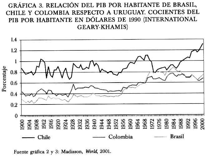 En la gráfica 3 aparecen representados los cocientes entre los PIB por habitante de algunos países latinoamericanos (Brasil, Chile y Colombia) y el de Uruguay. 2 El indicador muestra que, con oscilaciones, el nivel del PIB por habitante de Chile y Uruguay fue similar a lo largo del siglo, aunque tendió a ubicarse por debajo antes de la década de los ochenta. Sin embargo, a partir de allí, el PIB por habitante de Chile tiende a superar al de Uruguay. En el caso de Brasil y Colombia, más allá del descenso del indicador en los últimos años, es notorio que ambos países se han "acercado" a Uruguay entre 1900 y 2001.