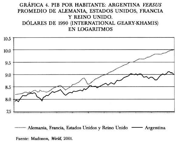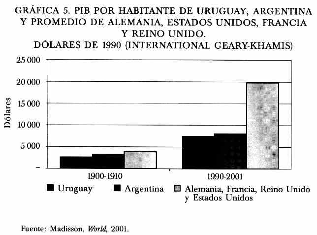 El particular desempeño económico del largo plazo de Uruguay parece ser un fenómeno común a las economías del Río de la Plata. La experiencia de Argentina en materia de crecimiento tampoco ha sido exitosa cuando se mira el siglo XX en su conjunto (véase gráfica 1), Entre 1901 y 1910 el producto por habitante de Argentina era superior a 90°/o del promedio de Alemania, Estados Unidos, Francia y Reino Unido, mientras que en los años noventa, este porcentaje se redujo a 36 por ciento (véase gráfica 4).