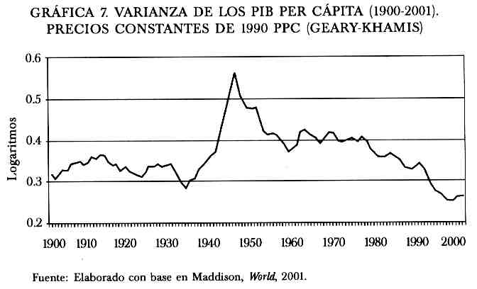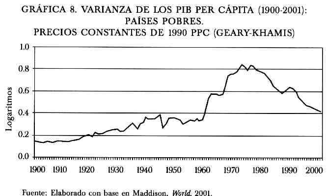A partir de la observación de las tres últimas gráficas, podría conjeturarse que la reducción de la varianza total de los ingresos per cápita de la muestra de países observada durante el siglo XX (véase gráfica 7) parece responder al desempeño exitoso de los países pobres que más compensó la mayor dispersión registrada entre los países medios. Nótese que en este último grupo se encuentran incluidos Argentina y Uruguay.
