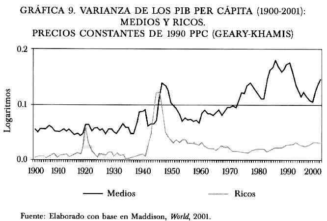 Un análisis similar se ha realizado para tres subconjuntos de países (pobres, medios y ricos). Como se puede apreciar en las gráficas 8 y 9 la dispersión de los ingresos per cápita en el interior de cada uno de estos grupos no sigue un comportamiento uniforme a lo largo del siglo.