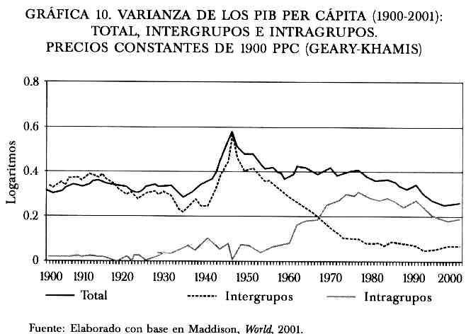 De la gráfica 10 parece desprenderse que la reducción de la dispersión total de ingresos verificada a partir de los años cincuenta responde al pronunciado descenso de la varianza entre los tres grupos que más compensó el aumento de la dispersión verificado en el interior de ellos. Lo anterior sugiere la presencia de comportamientos diferenciados entre economías o tal vez clubes de economías.16