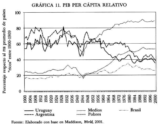 En la gráfica 11 se observa que mientras los países de la muestra que eran pobres y medios entre 1900-1909 se "acercan" a lo largo del siglo a los que eran ricos (pudiendo encontrarse evidencia de algún tipo de convergencia o al menos acercamiento), Argentina y Uruguay se "alejan". Además, la gráfica 11 permite conjeturar que el "rezago" de las economías del Río de la Plata tiende a consolidarse en la segunda mitad del siglo y que el proceso empieza a manifestarse antes en Uruguay que en Argentina.