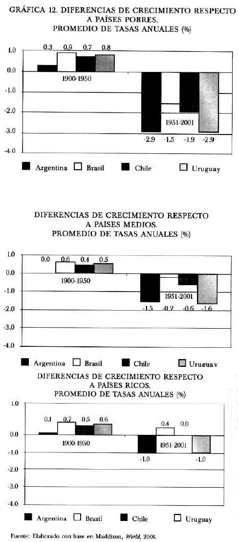 En la gráfica 12 se representan las diferencias de los promedios de las tasas anuales de crecimiento durante la primera y la segunda mitad del siglo entre Argentina, Brasil, Chile y Uruguay y las economías que eran pobres, medias y ricas entre 1900 y 1909, Puede observarse que, en la segunda mitad del siglo XX, Argentina, Brasil, Chile y Uruguay crecen menos que el promedio de países que eran pobres, medios y ricos en la primera década del siglo pasado. La única excepción es cuando se compara Brasil con los países ricos. Una vez más, ello refleja que el declive es un rasgo distintivo del desempeño económico del Río de la Plata durante el siglo XX.