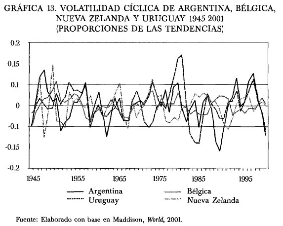La gráfica 13 muestra una comparación de las fluctuaciones cíclicas de cuatro países: Bélgica, Nueva Zelanda, Argentina y Uruguay para el periodo comprendido entre 1945 y 2001.25 Estas son más pronunciadas para los casos de Argentina y Uruguay que para Bélgica y Nueva Zelanda, especialmente durante la segunda mitad del siglo XX. Esto es particularmente notorio a partir de los años setenta, precisamente cuando los niveles de riqueza de Argentina y Uruguay se alejan de los de los países ricos.