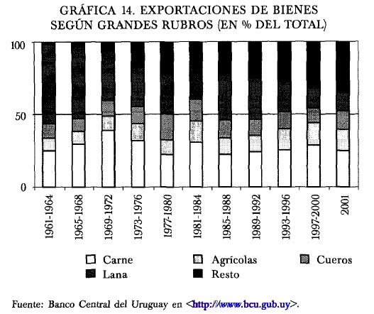 Al igual que la mayoría de los países latinoamericanos, la inserción internacional de Uruguay está caracterizada por ser un país exportador de productos primarios intensivos en recursos naturales y mano de obra, importador de bienes elaborados intensivos en capital, así como por ser un demandante neto de capitales. Si bien durante los últimos 30 años las exportaciones de bienes de Uruguay se han diversificado en forma notoria, entre 1997 y 2001 el 68% de ellas seguía estando compuesto por productos de origen primario (véase gráfica 14). Debido a ello, los precios de exportación son volátiles.