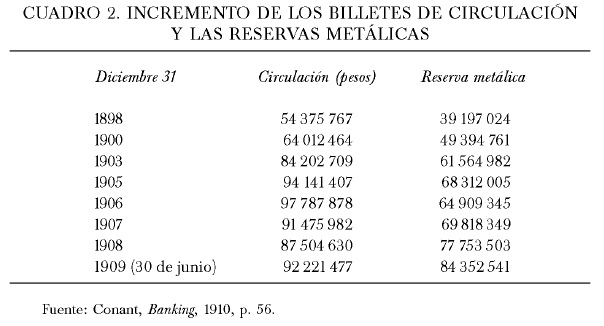 Como hemos visto, en 1906 las reservas de los bancos se convirtieron rápidamente de plata a oro. Con la depresión de 1908 se redujo la proporción de oro en la reserva e incrementó la proporción de plata. Entre diciembre de 1907 y febrero de 1908, las posesiones de oro de los bancos cayeron de 53 854 896 pesos a 48 974 648 pesos, mientras que en el mismo periodo las posesiones de plata incrementaron de 15 963 452 pesos a 16 156 988 pesos y al 30 de junio de 1908 a 23 908 748 pesos. ¿Este proceso fue un regreso al bimetalismo?