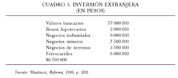 Como se observa en el cuadro anterior, las inversiones estuvieron dirigidas fundamentalmente a incrementar el capital bancario a 57 600 000 pesos (66.6%). Los negocios industriales fueron la segunda actividad más importante a la que se dirigió la inversión extranjera con una suma de 9 900 000 pesos (11.4%); en empresas mineras la inversión fue del orden de 7 500 000 pesos (8.7%); la venta del Ferrocarril Hidalgo fue por 6 000 000 de pesos (6.9%); la venta de tierras por 3 500 000 pesos (4%), y la venta de bonos hipotecarios por 2 000 000 de pesos (2.3%). Con la adopción de la reforma monetaria, el capital extranjero llegó a México en una magnitud nunca antes vista. Al respecto, Limantour declaró: "Esta entrada de dinero no ha ocasionado sorpresa a los autores del nuevo régimen monetario; la entrada de capital extranjero fue precisamente uno de los objetivos por los cuales se aplicó la reforma."38