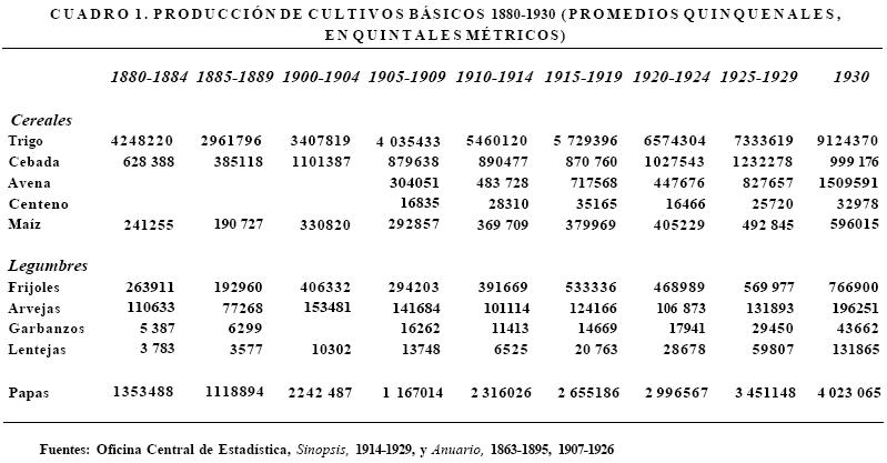La agricultura chilena experimentó una extraordinaria expansión y diversificación durante la Era del Salitre. La producción aumentó en todos los subsectores agropecuarios, particularmente en los cultivos básicos, que constituían una parte importante de las materias primas para las industrias de alimentos y, ciertamente, eran los principales componentes de la dieta de los consumidores urbanos, sobre todo de la clase obrera (véase cuadro 1).9
