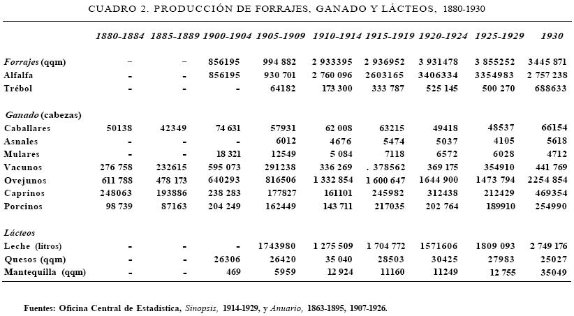 Por su parte, el sector ganadero, en un sentido amplio, fue un importante componente de la economía rural chilena y, como indica el cuadro 2, la producción de forrajes, ganado y derivados lácteos aumentó tendencialmente en el periodo 1880–1930. Los cultivos forrajeros se convirtieron en una importante línea comercial para un sector de las grandes haciendas, cuyos dueños expandieron la "industria del pasto aprensado" que abastecía de paja de alto valor nutritivo a las propiedades especializadas en la crianza de ganado fino para la producción de carne y lácteos, así como a los servicios de transporte animal en las ciudades y centros mineros. Aunque se cultivaba una variedad de plantas forrajeras, la producción para el mercado consistía principalmente de alfalfa y trébol, tanto de suelos irrigados como "de secano". En la primera década del siglo XX el producto alcanzaba ya casi 1 000 000 de qqm: 856 195 qqm en 1900-1904 y 994 882 qqm en 1905–1909; sin embargo, esas cifras son sólo aproximaciones, pues no toda la alfalfa y el trébol eran segados para producir paja. Además, el output total fue considerablemente más alto en la década de 1910, casi 3 000 000 de qqm, lo cual difícilmente podría ser el resultado de un brusco aumento en relación con los años anteriores. Durante los años veinte, la producción llegó a casi 4 000 000 de qqm, para, al parecer, disminuir hacia 1930, como lo sugiere el censo agropecuario de ese año.