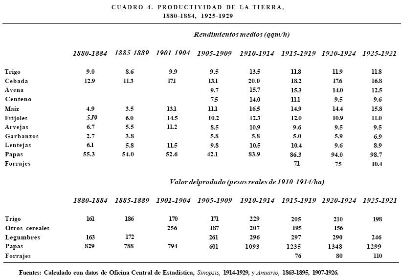 Al contrario de la visión tradicional, el análisis de los datos disponibles para los cultivos más importantes indica que la expansión que la agricultura chilena experimentó en la Era del Salitre se caracterizó también por significativos avances en la productividad de la tierra, definida esta como rendimientos en quintales métricos por hectárea (véase cuadro 4).
