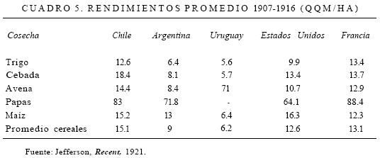 Así, en parte gracias a la introducción de nuevas variedades y de métodos de control de plagas que contribuyeron a mejorar el cultivo del trigo en Chile, los rendimientos no disminuyeron, aunque el área cultivada aumentó casi 40% entre 1880 y 1930. Por esta razón, además, los niveles de la productividad de la tierra en el cultivo del trigo en Chile eran más que adecuados para estándares internacionales. En este sentido, es ilustrativa la información reunida por el geógrafo estadunidense Mark Jefferson, quien visitó Chile en 1918 como miembro de la American Geographical Sóciety's Expedition to A. B. C. Countries. Usando datos publicados en el Annuaire International de Statistique Agricole (véase cuadro 5), Jefferson observó que "los rendimientos [eran] elevados en todos los cultivos", y así concluyó que la agricultura chilena era "más intensiva que la mayoría de los países latinoamericanos". Además, Jefferson constató que "el rendimiento del trigo, que es el principal cultivo de Chile, es mucho mayor que el de su gran vecino triguero, la república Argentina, [que] produce ocho veces más trigo que Chile [pero] usando una superficie casi 16 veces mayor para ello".29