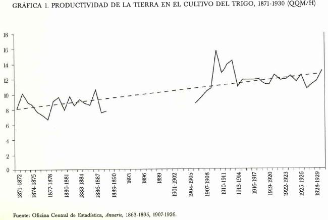 Dada su importancia como principal producto de la agricultura chilena en ese periodo, el cultivo del trigo constituye un caso de estudio relevante para examinar las tendencias a largo plazo en la productividad de la tierra. Como indica la gráfica 1, que representa los rendimientos de trigo en los años agrícolas de 1872–1889 y 1908–1930, la productividad tendió a aumentar hasta la primera guerra mundial; en adelante, en realidad no disminuyó, sino que se mantuvo estable en casi doce qqm/ha, una cifra que representa un incremento de 35% respecto de los rendimientos promedio de 8.7 qqm/ha del periodo 1872–1876.