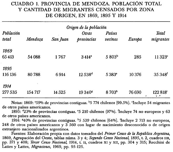 31 Como se desprende del cuadro 1, en 1869, momento de auge del negocio ganadero, los europeos eran sólo 0.4% de la población total; pero cuando avanzaba la vitivinicultura moderna, en 1895, ya representaban 9% y, en 1914, con la agroindústria consolidada, llegaron a 27.6%.