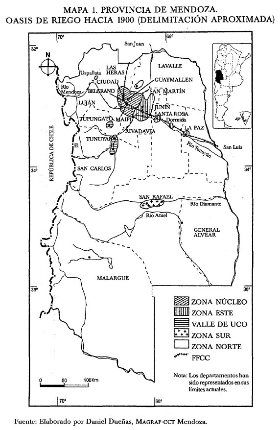 La provincia de Mendoza, situada en el centro-oeste de Argentina, es un espacio limítrofe con la república de Chile. La escasez e irregularidad de las precipitaciones pluviales en el llano (200 mm por año) obligan a desarrollar las actividades humanas, urbanas y rurales, en oasis de regadío. El sistema de irrigación está basado en la utilización de las aguas de los principales ríos que nacen en el macizo andino: el Mendoza y el Tunuyán, que forman el Oasis Norte; y el Diamante y el Atuel, que dan vida al Oasis Sur (véase mapa 1). El 96% de la población se concentra en los oasis, 3% apenas de la superficie total, mientras que el resto se distribuye en los valles cordilleranos, en la precordillera y en el semidesierto del centro y el oriente de la provincia.