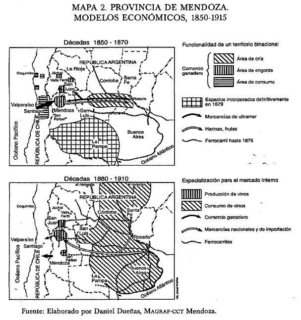 A comienzos de la década de 1850 Mendoza articulaba un activo comercio ganadero con Chile, integrando una región binacional que comprendía las zonas productoras del este argentino con el mercado consumidor trasandino (véase mapa 2). El desarrollo del espacio productivo local estaba centrado en una agricultura subordinada a tal comercio, sin perjuicio de lo cual, los cultivos de trigo sostenían una molinería que abastecía al mercado mendocino y colocaba excedentes en otras provincias, atenuando el déficit comercial generado por las compras de ganado. El Oasis Norte estaba cubierto por extensos alfalfares para engorde; otros microoasis aparecían en puntos estratégicos sobre los caminos de vinculación con el Litoral y Chile a fin de restaurar el desgaste del ganado en tránsito.