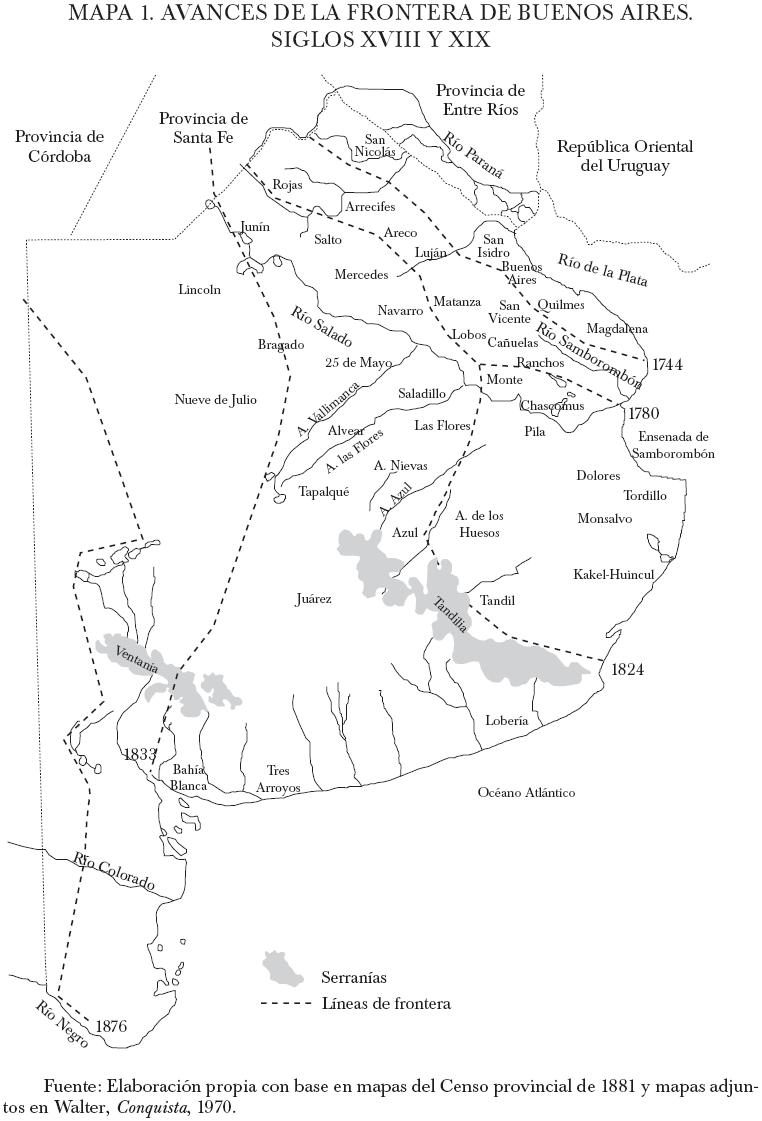 Es decir, que cada avance de la frontera implicaba una inmediata ocupación y posterior entrega de los títulos que traspasaban las tierras del dominio público al privado, las que quedaban en mejores condiciones de ser negociadas. Por supuesto que esto implicaba el crecimiento demográfico y económico de la campaña, que además de la ampliación del factor tierra, incorporaba capitales en las unidades productivas y los transportes y recibía el aporte de mano de obra extranjera.11