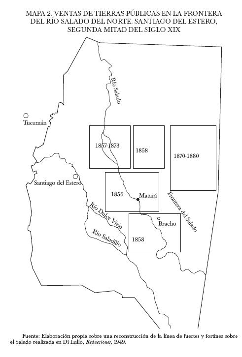 De esta manera, se alentó vivamente la formación de una burguesía comercial ligada a una inmigración urbana con acciones estatales muy concretas, y fue el periodo en el que aparecieron grandes grupos inversionistas extraprovinciales que acapararon las tierras públicas, la mayor parte de ellas sobre los nuevos límites con Santa Fe y el Chaco. Los enormes latifundios serán entonces la marca de registro del liberalismo roquista santiagueño que para 1914 tuvo un periodo de regresión por el conflicto mundial,43 en combinación con la pequeña y mediana propiedad que se ubicaba en los restos de terrenos que los obrajes dejaban. En este contexto encontramos las ventas de tierra en el antiguo Matará, una de las dos divisiones del espacio allende el río Salado del Norte, que significaba alrededor de 50% de la tierra de la provincia.