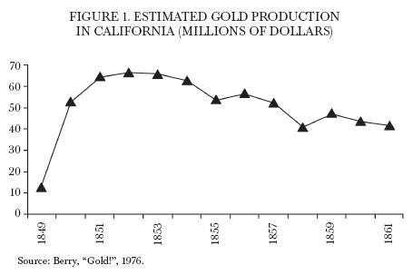 Agricultural histories of California during the gold rush period tend to focus on the years after 1860, by which time the chaos of the mineral boom had disappeared and grain shippers were sending large cargoes of wheat to Great Britain. One consequence of this focus is that economic historians have overlooked the decade of the 1850s, when the wage and price effects of the gold rush were still factors in the regional economy, the state's ability to feed itself was in doubt, and no one believed it would be possible to ship exports 14 000 miles across two oceans and be competitive in British grain markets. Significant production of wheat and flour did not start in the 1860s, but in 1852, the same year as the peak in gold production.1 Production took off then even though the state's leading newspaper had editorialized the year before that "It may be some years ere the State shall produce sufficient breadstuffs for home consumption."2 That is, the reality of self sufficiency and an export surplus in 1854 came as a surprise to the locals; the timing should also be surprising to economic historians because analysis of mineral booms -the so-called Dutch disease model- shows that the production of tradable goods shrinks during positive supply-side shocks such as gold rushes.3 California, however, appears to be exceptional, since it seems to be a case where a mineral boom led to an expansion of tradable goods.