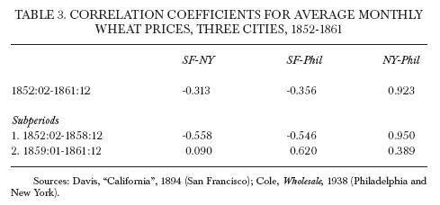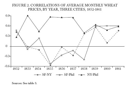 Quantitatively, market integration can be examined by comparing the correlation in price movements between two or more markets.56 The simplest approach is to compare the correlation coefficients of prices between San Francisco and an East Coast market with those between two markets that are presumed to be relatively integrated. Table 3 shows the correlations of monthly wheat prices in three markets: San Francisco, New York, and Philadelphia. The correlations between New York and Philadelphia are a standard for judging the integration of San Francisco with the East Coast. Over the period as a whole, there is no link between San Francisco and the two East Coast markets, while New York and Philadelphia are tightly linked. Looking at two subperiods, however, there appears to be a significant change around the end of the decade, partially offset by the low correlation coefficient for San Francisco-New York in 1860. In figure 2, showing the average monthly wheat price correlations for each year, the trend towards market integration is clear. Beginning in 1858 or 1859, San Francisco's prices began to mirror prices elsewhere in the national market (see table 3 and figure 2).57