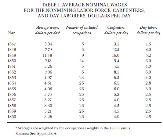 According to theory, gold mining should have pulled labor from the rest of the economy and driven up wages. Returns to labor in the placer mines set the standard for the rest of the economy. In May of 1848, the San Francisco newspaper The Californian put the average daily take in the gold placers at $20, although most other reports in 1848 put it at around $16, or an ounce of dust per person per day. Either figure was a fantastic sum at the time, and was a measure by which all could judge alternative employment. In the accounts of wages in late 1848 and 1849, $16 per day was routinely recorded as the price of carpenters and other skilled artisans and mechanics. Table 1 shows the trend for wages, 1847 to 1860 (see table 1).27
