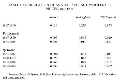 Table 4 looks at a longer period and a wider variety of products in three cities, San Francisco, New York, and London.58 Once again, the pattern of relatively higher integration in North Atlantic markets during the 1850s is followed by relatively similar integration between all three pairs of markets from 1860 to 1900.59 In sum, during the 1850s, New York and Great Britain were far more integrated than San Francisco and New York. In fact, there is scant evidence that New York price movements had any effect on California, or vice versa. This changed sometime in the late 1850s, and San Francisco and New York became approximately as integrated as New York and London (see table 4).