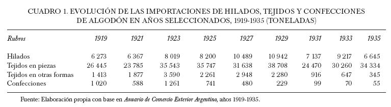Durante el primer tercio del siglo XX el auge de las exportaciones argentinas de carnes y cereales, la gran inmigración y la urbanización alentaron el robustecimiento del mercado interno local que, en términos del ingreso per cápita, se convirtió en el más importante de América Latina. Entonces la demanda local de textiles era satisfecha en forma predominante por la corriente importadora; esta representó 78% del total del consumo interno en el primer lustro de la década de 1910.7 En las décadas siguientes, la introducción de textiles continuaría siendo el principal rubro del comercio importador.