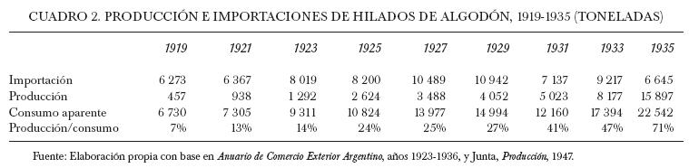 En conjunto, en 1918, sólo existían dos hilanderías de algodón con 10 300 husos instalados. Por entonces, la demanda interna de hilados era cubierta casi totalmente por la corriente importadora. La situación se modificó en la década siguiente. Alentada por la expansión del cultivo en el Chaco, la industria local logró algunos avances significativos en cuanto al incremento de su participación en el total del consumo interno. Si bien el monto de importaciones continuó siendo importante e incluso se incrementó hasta alcanzar un récord en 1929 (véase cuadro 1), la participación de la producción doméstica de hilados en el consumo local ascendió desde una cifra insignificante hasta cubrir, a mediados de la década de 1920, una cuarta parte del total (véase cuadro 2).