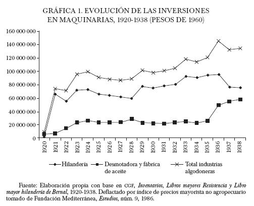 La gráfica 1 permite observar la evolución de las inversiones realizadas en maquinarias durante el periodo de entreguerras. Pueden identificarse tres momentos de grandes inversiones; la primera mitad de la década de 1920, 1929 y los años 1933-1935. En el primer periodo, las inversiones más importantes se concentraron en la hilandería con la instalación del equipo productivo principal, que constaba de unos 10 660 husos. La capacidad inicial de producción de la planta era unas 1 500 toneladas anuales de hilados. La maquinaria adquirida permitía a la empresa fabricar hilados de diverso tipo y mecha de algodón destinada a la industria fosforera. Inicialmente, la empresa también se interesó en la fabricación de telas. Con este fin, en 1921 se adquirieron varios telares mecánicos para iniciar una producción experimental. Luego de la inversión principal realizada a comienzos de la década, la empresa no realizó grandes compras de maquinaria. De todas formas, en los años veinte se adquirieron equipos destinados a incrementar la producción de ciertos artículos que encontraban una sostenida demanda en el mercado interno como, por ejemplo, maquinaria para conos de madeja, alistadoras, equipos para elaborar hilados cilindrados y otros para producir hilados mercerizados.32