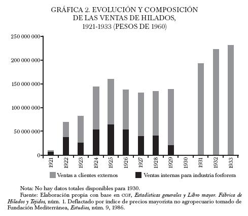 48 ACGF, LAAG, vol. 5, acta del 20 de mayo de 1925, f. 52. A partir de 1930, las ventas internas de hilados se extinguieron con la separación de las plantas fosforeras y la constitución de otra empresa vinculada, la Compañía General de Fósforos Sudamericana.