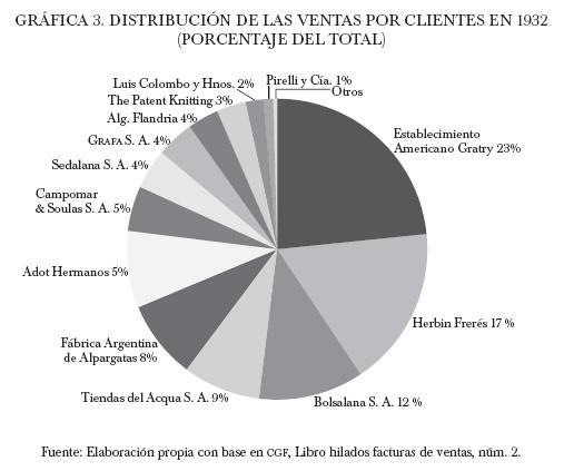 ¿Quiénes eran sus clientes? Se trataba de las principales firmas textiles del país. En la gráfica 3 se observa la distribución de las ventas de la empresa en 1932. Poco más de 50% de las ventas se colocaba entre las tejedurías a lanzadera y de punto como Establecimientos Americanos Gratry, Herbin Frerés y Tiendas del Acqua, que eran fábricas de antigua instalación. Por su parte, Sedalana, la primera tejeduría de rayón fundada en 1925, adquiría hilados de algodón y de rayón. La otra mitad de las ventas era colocada entre grandes hilanderías de lana o algodón, algunas de ellas recientemente inauguradas, cuya producción no cubría las necesidades de sus propias tejedurías como Algodonera Flandria, Campomar & Soulas, GRAFA, Laurencio Adot o Alpargatas. La importancia de estas hilanderías como clientes revela que la CGF había desembarcado tempranamente en el sector y se veía entonces beneficiada por la coyuntura creada por la crisis mundial que obligó al gobierno a reducir temporariamente las importaciones y alentó su sustitución por productos argentinos. Finalmente, Pirelli Sociedad Anónima Platense, filial local de la empresa italiana, adquiría el "hilado cilindrado" que la CGF lanzó al mercado en 1927.
