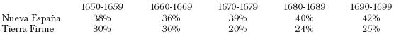 Se observa que el tráfico hacia Nueva España permanece muy estabilizado a lo largo de toda la mitad de la centuria; hay una ligera tendencia a incrementarse a partir de los años setenta y alcanza la máxima cota en el decenio de finales del siglo. En cambio, se observa una tendencia contraria en el tráfico hacia Tierra Firme. Los datos se extrajeron de García, Comercio, 1980, pp. 164, 215.