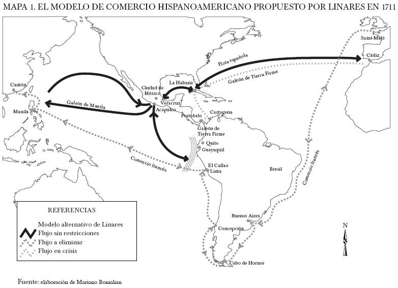 El nuevo esquema que propone Linares es, sin lugar a dudas, un notable fortalecimiento a la centralidad mercantil de los comerciantes de la ciudad de México: son los que controlarían todo el tejido de flujos que se trazan por el imperio español. Monopolizarían las importaciones de ambas Carreras: la del Atlántico y la transpacífica y desplazarían a los cargadores sevillanos del papel de abastecedores de mercaderías sobre el espacio peruano. En resumen, el modelo mercantil sugerido por Linares no es sino un intento por oficializar el proceso de relativa autonomía mercantil que por entonces vive el virreinato de Nueva España respecto a la metrópoli española (véase mapa 1).12